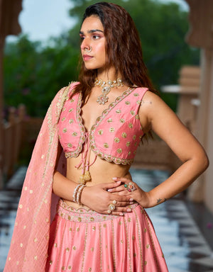 Pink lehenga set is adorned with Aari work, Dabka and Nakshi. It is perfectly complemented by an embroidered blouse and an embroidered benarsi tissue dupatta.