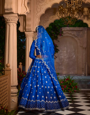 Neel lehenga set is adorned with Aari work, Dabka and Nakshi. It is perfectly complemented by an embroidered blouse and an embroidered organza dupatta.