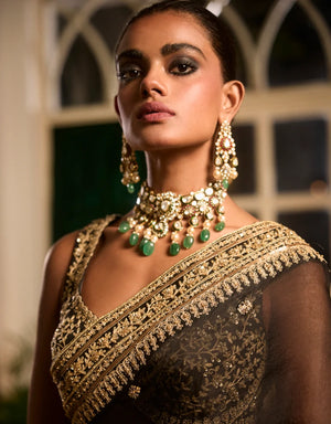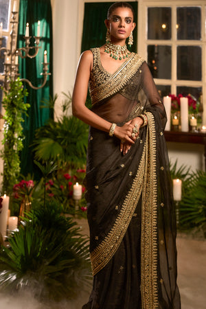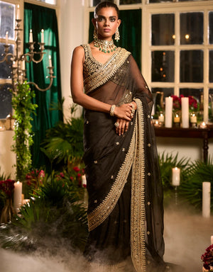 Black organza saree set is adorned with dori,moti, dabka and nakshi work. It is perfectly complemented by an embroidered black blouse.