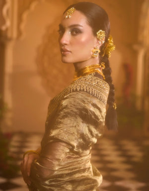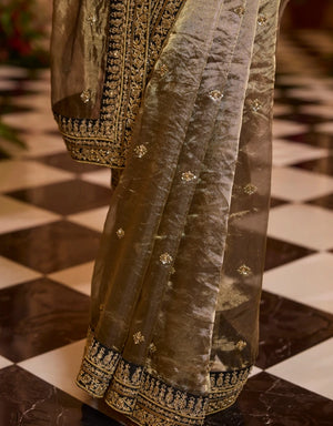 Tissue saree set is adorned with dori, moti, dabka and nakshi work. It is perfectly complemented by an embroidered black blouse.