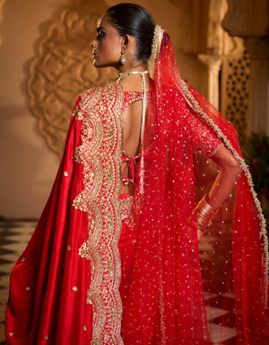 Red silk saree set is adorned with aari, dabka and nakshi work. It is perfectly complemented by an embroidered red blouse.