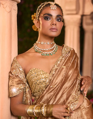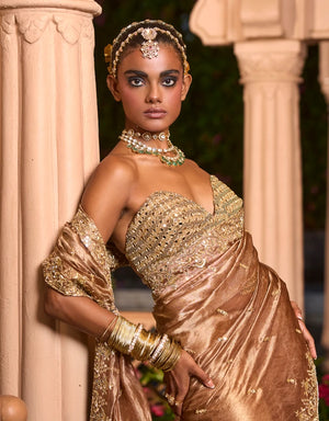 Tissue saree set is adorned with Aari, Mirror, Dabka and Nakshi work. It is perfectly complemented by an embroidered blouse.
